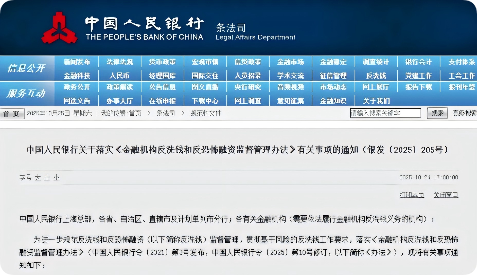 10月24日,中国人民银行发布《关于落实〈金融机构反洗钱和反恐怖融资监督管理办法〉有关事项的通知》(银发〔2025〕205号)自,2025年12月1日起施行。